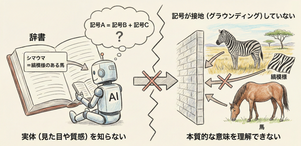 辞書には「シマウマ=縞模様のある馬」と書かれています。しかし、AIが「縞模様」や「馬」の実体(見た目や質感)を知らなければ、それは「記号A = 記号B + 記号C」という数式を見ているのと同じであり、いつまで経っても本質的な意味を理解することはできません。これを「記号が接地(グラウンディング)していない」と言います。