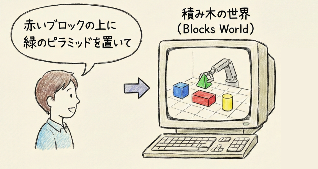 SHRDLUは、コンピュータ画面上の「積み木の世界(Blocks World)」において、人間が英語で入力した指示(例:「赤いブロックの上に緑のピラミッドを置いて」)を解釈し、実際にアームを動かして操作することができました。