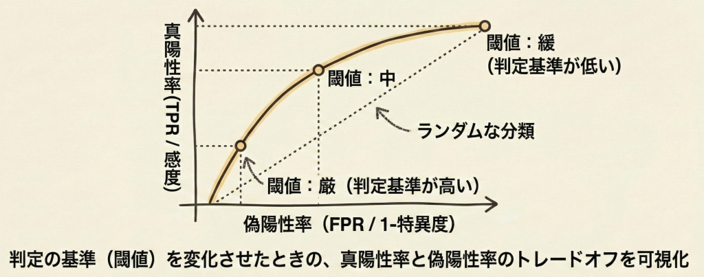 - 閾値との関係:ROC曲線は「閾値を0から1まで変化させたときの軌跡」を描いたものです。特定の閾値での一点の性能ではないことに注意してください。