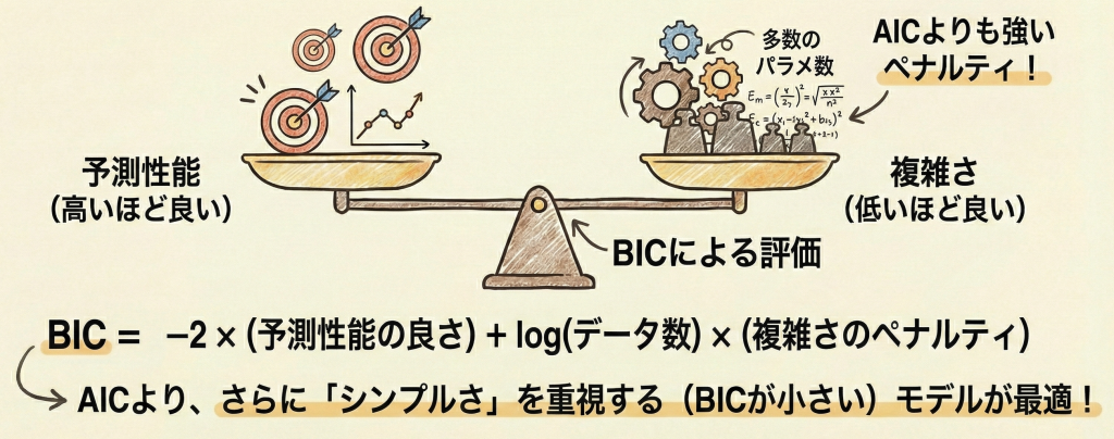 データ数が増えれば増えるほど、パラメータを増やすことへのペナルティが重くなるため、BICはAICに比べて「より不要な変数を削ぎ落とした、シンプルなモデル」を選択する傾向があります(過学習への耐性が強い)。
