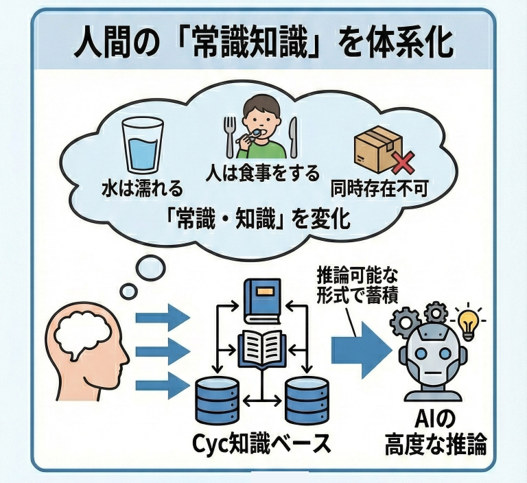 Cycプロジェクトは、こうした膨大な「一般常識」を、人間が手作業で論理式(推論できる形式)としてコンピュータに入力し続けることで、真に賢いAIを作ろうとしています。