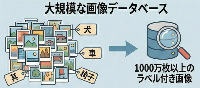 ImageNetの最大の特徴は、単に画像を集めただけでなく、「WordNet(ワードネット)」という概念辞書(言葉の意味の階層構造)に基づいて分類・整理されている点です。