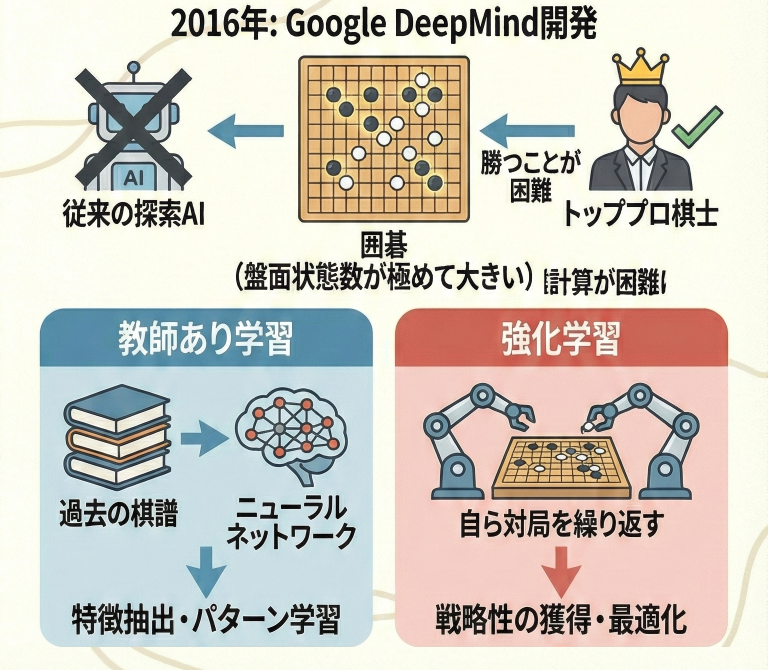 AlphaGoは、まず人間のプロ棋士の棋譜を真似る「教師あり学習」を行い、その後、自分自身と対局を繰り返す「強化学習」によって強さを磨き上げました。
