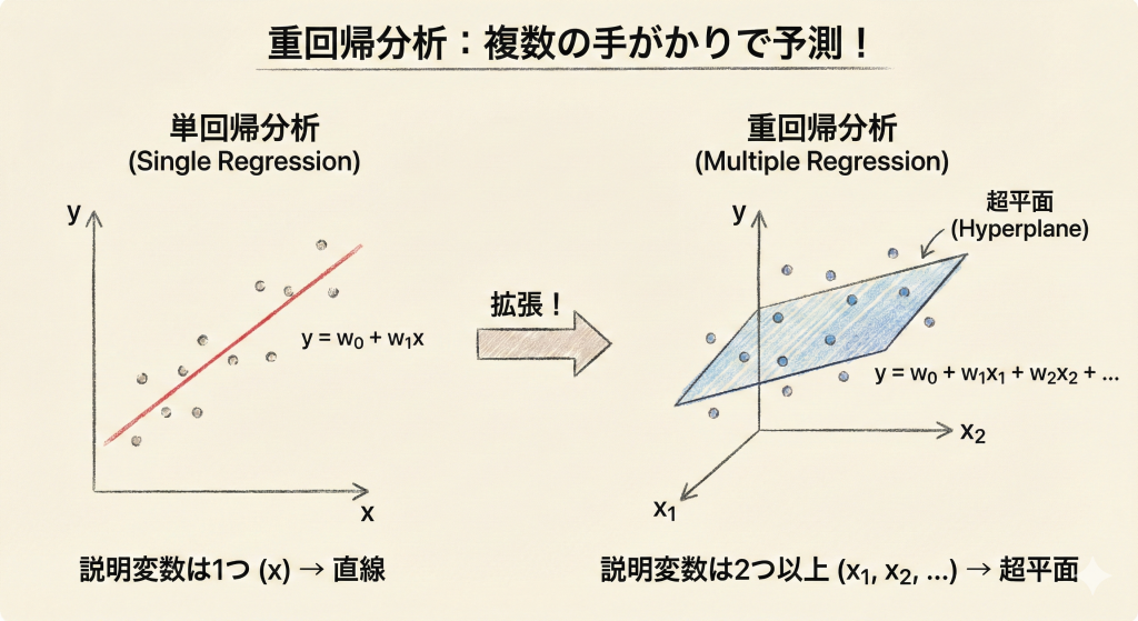 重回帰分析とは、1つの目的変数(予測したい値)に対して、2つ以上の説明変数(予測の手がかりとなる値)を使って予測を行う回帰分析の手法です。