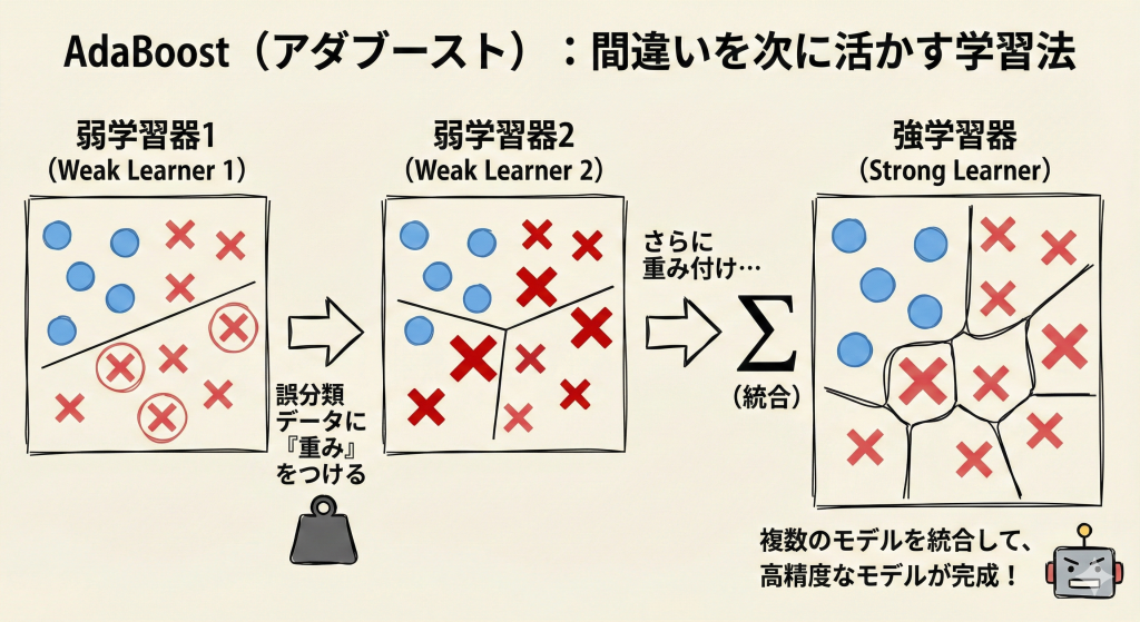 - メカニズム:「誤分類されたデータの重み(Weight)を更新する」ことで精度を上げる。