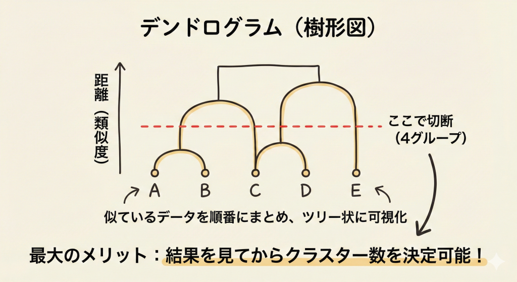 - メリット:クラスター数(グループ数)を事前に決める必要がなく、図を見てから事後的に決定できる。