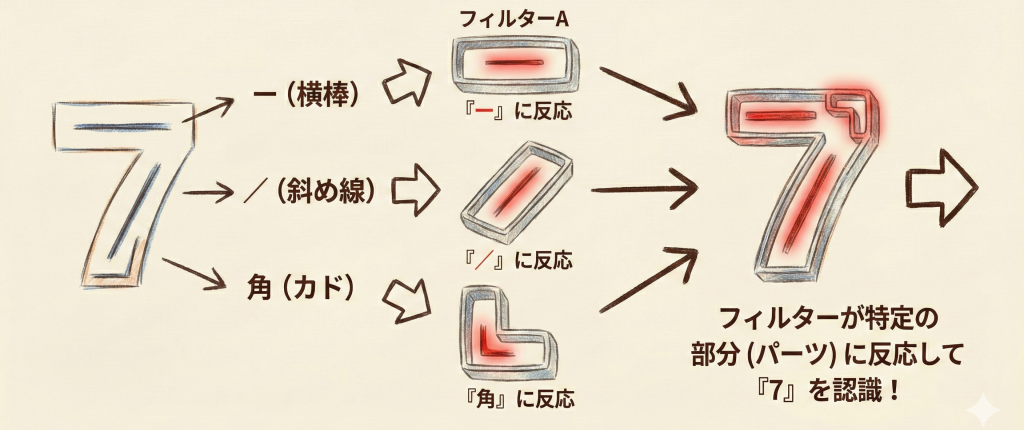 これらを画像の上でスライドさせることで、「ここに横棒がある!」「ここに角がある!」という発見(特徴抽出)を行っているのです。