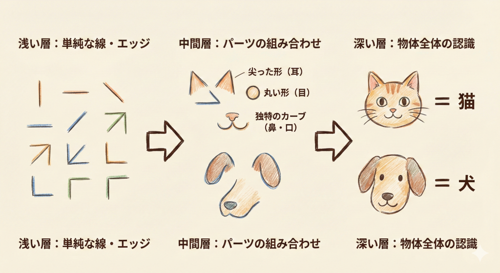 では、ただの「線」や「角」を見つけるだけで、なぜ複雑な「猫」などがわかるのでしょうか。ここで重要になるのが「ディープ(層が深い)」という点です。