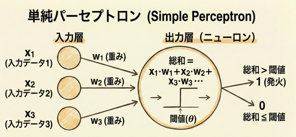 仕組みは非常にシンプルで、入力層」と「出力層」の2層だけで構成されています。複数の入力データに対して「重み」を掛け合わせ、その合計がある「閾値(しきい値)」を超えたら「1(発火)」、超えなければ「0」を出力します。