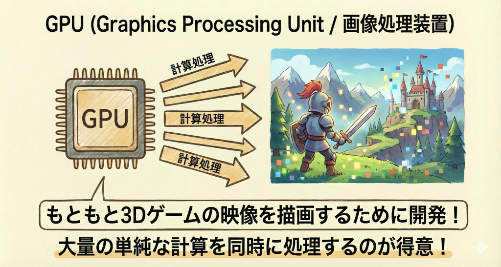 • 構造:数千個の小さなコアを持ち、「並列処理」に特化している。