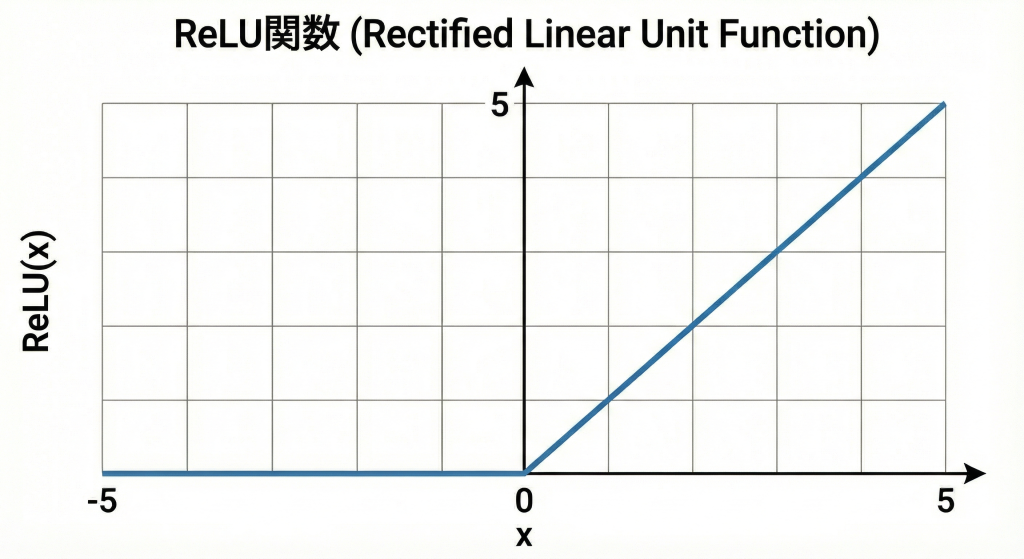 • 入力が正のとき(x > 0):そのまま出力(傾きはずっと1)