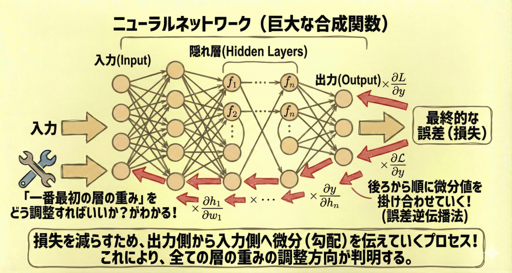 • 数学的根拠:微分の「連鎖律(チェインルール)」を利用している。