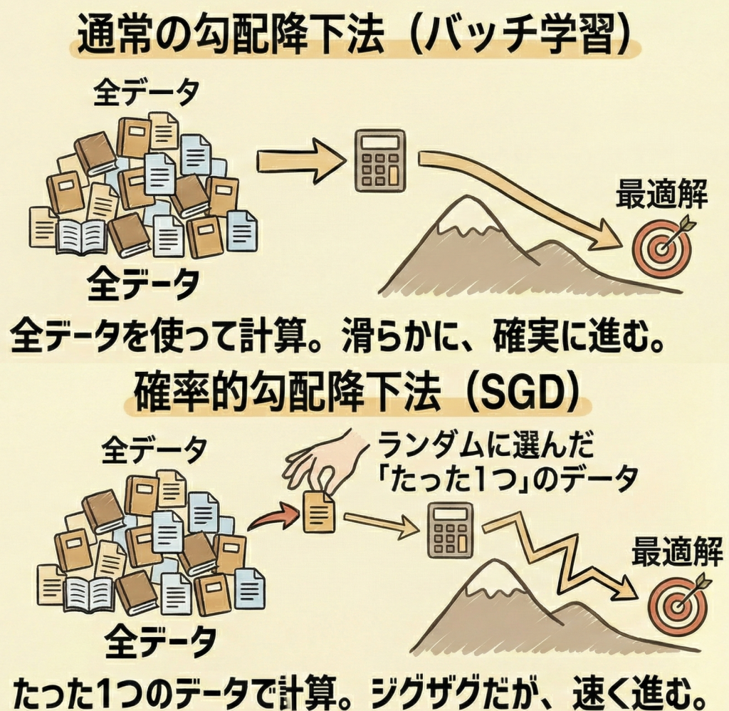 通常の勾配降下法(バッチ学習)が「全員の意見を聞いてから慎重に一歩進む」のに対し、SGDは「通りすがりの一人の意見だけを聞いて、すぐ一歩進む」ようなものです。