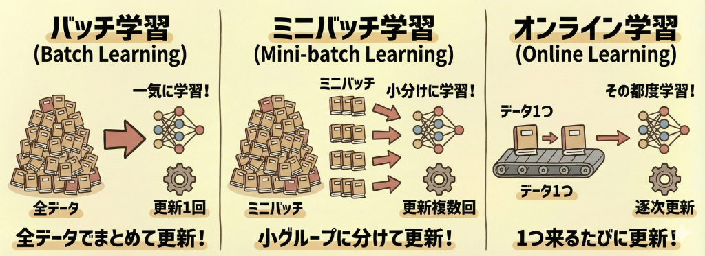 メリット:メモリ消費が最も少ない。株価予測やネット通販のレコメンドなど、データが次々と発生する「ストリーミングデータ(リアルタイム)」の処理に必須の手法。 デメリット:1件のノイズ(外れ値)に振り回されやすく、学習の軌道がジグザグにブレやすい。 |