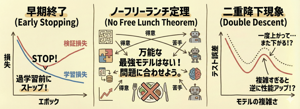 ここでは、AIの学習をうまくコントロールするための手法と、AIにまつわる不思議な法則を3つ紹介します。
