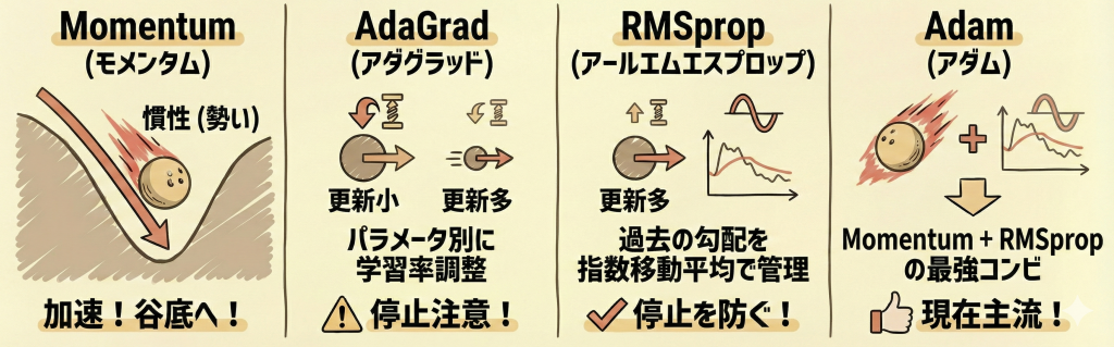 AdaGradの「学習が止まる」欠点を修正した手法。過去の勾配を「指数移動平均」で管理し、古い情報を忘れながら学習率を調整します。 - Adam(アダム):