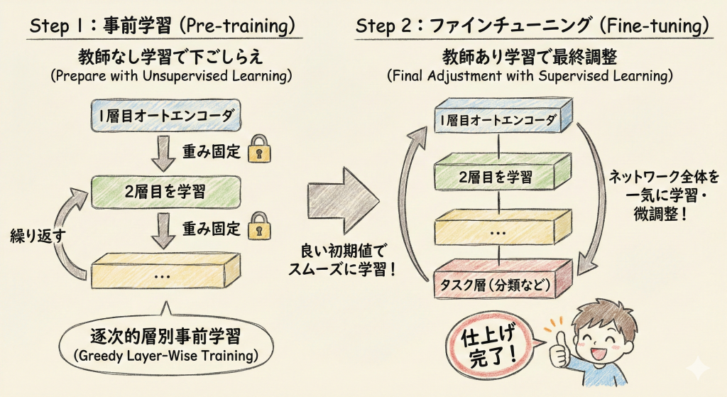 いきなり全体を学習させるのではなく、以下の2段階の手順を踏むのが最大の特徴です。