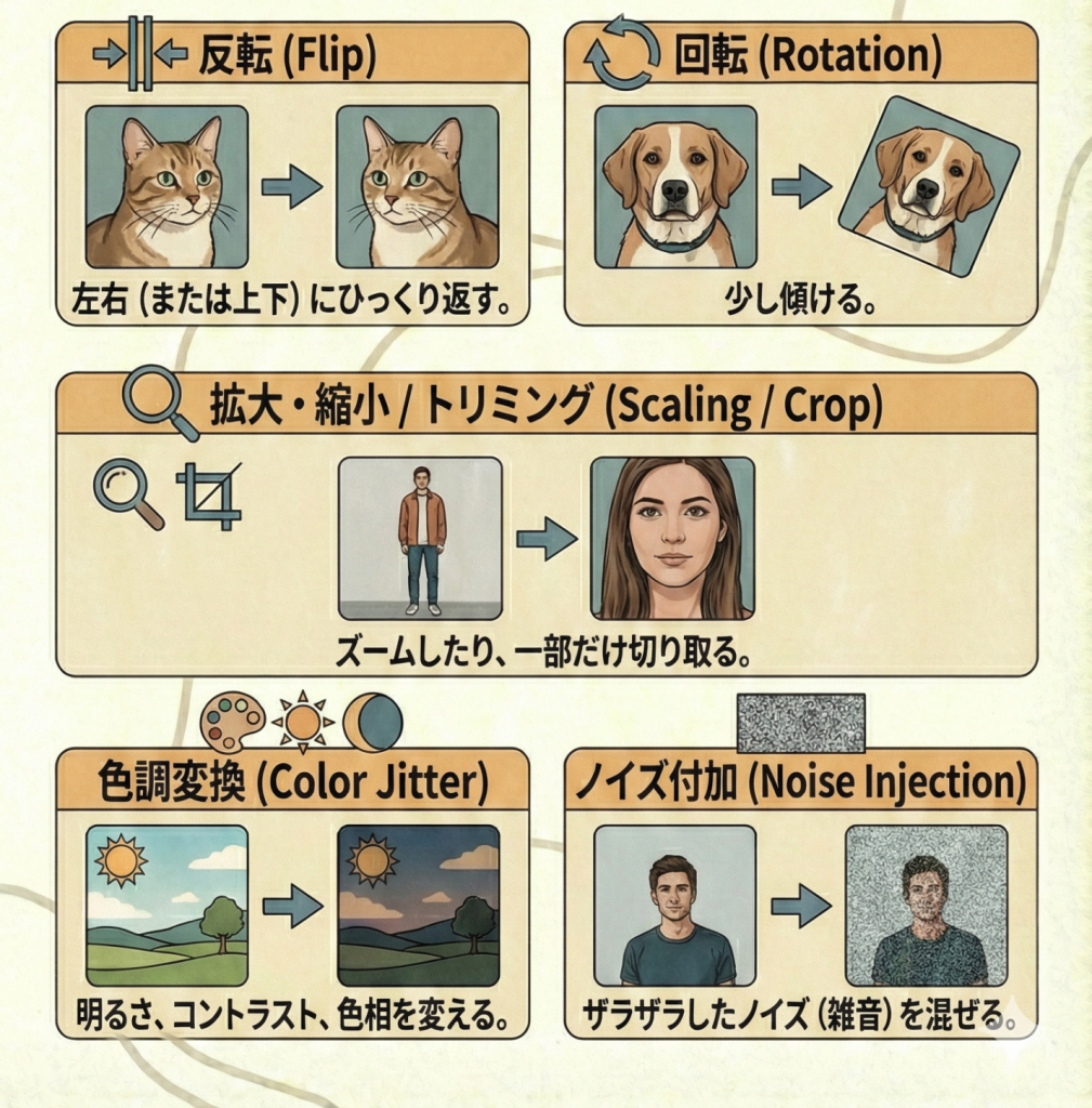 AI(ディープラーニング)は、学習データが少ないと、教科書を丸暗記するように答えだけを覚えてしまう「過学習」を起こしやすくなります。そこで、元の画像やデータに少し変化を加えることで、「似ているけどちょっと違うデータ」を大量に作り出し、AIに多様なパターンを学習させて賢くします。