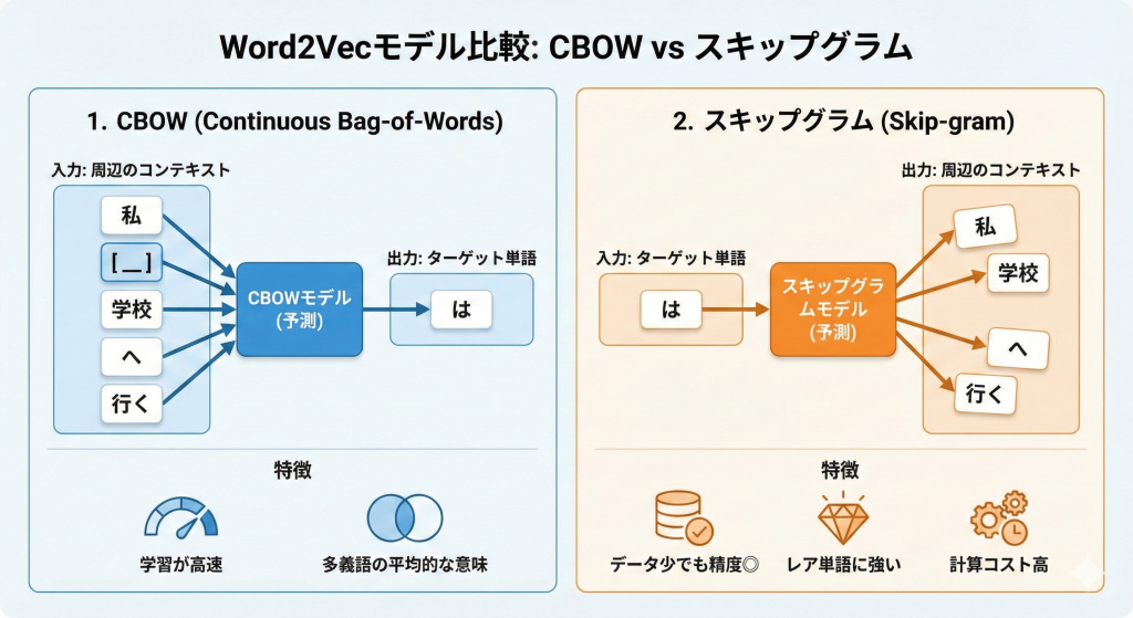 word2vecには、学習のさせ方に2つのモデル(アルゴリズム)があります。「何を入力して、何を予測させるか」の違いを整理して覚えましょう。