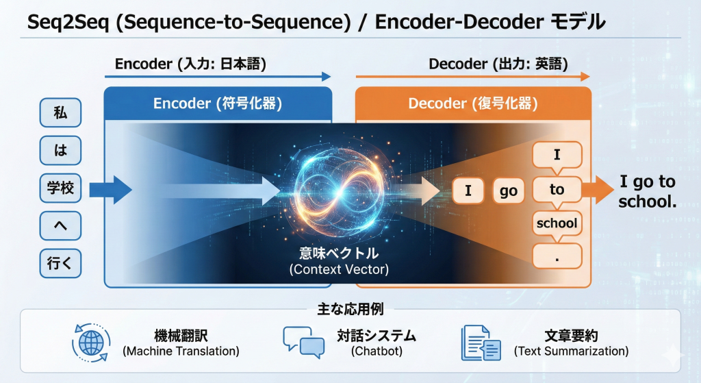 ある時系列データ(文章など)を、別の時系列データに変換するモデルです。「Encoder-Decoderモデル」とも呼ばれます。