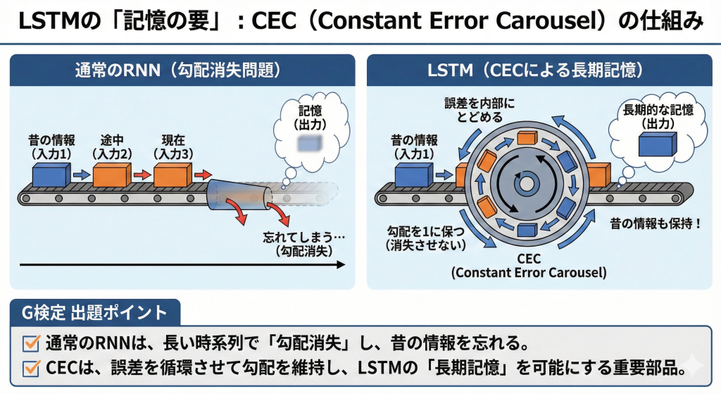 CECは、「誤差を内部にとどめ、勾配を1に保つ(消失させない)」仕組みを持ち、これにより長期的な記憶が可能になりました。