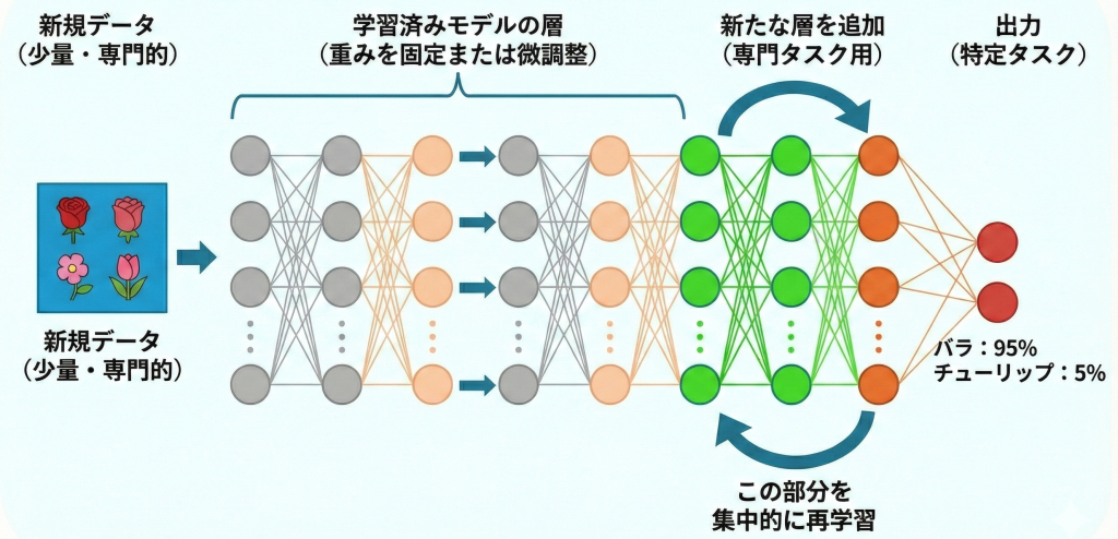 転移学習の一種ですが、単にモデルを「知識の引き出し(特徴抽出器)」として使うだけでなく、モデルの中身自体を少し書き換えて(微調整して)、新しいタスクに特化させる点に特徴があります。