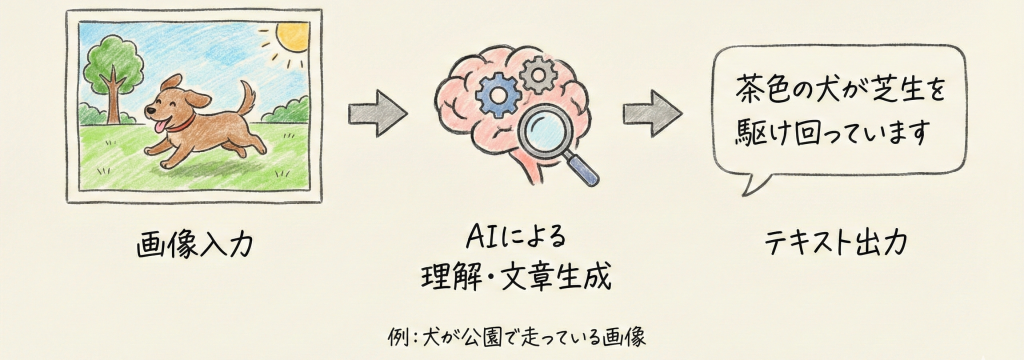 「画像→テキスト」のタスクです。入力された画像の内容を理解し、それを説明する適切な文章を生成します。(例:犬が公園で走っている画像を見て、「茶色の犬が芝生を駆け回っています」と出力する)