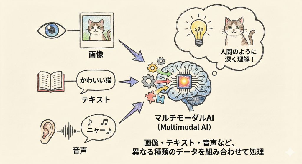 これまでのAIは「画像認識だけ」「翻訳だけ」といったシングルモーダルな処理が中心でした。しかし、異なる情報を統合することで、AIはより深く、柔軟に世界を認識できるようになります。
