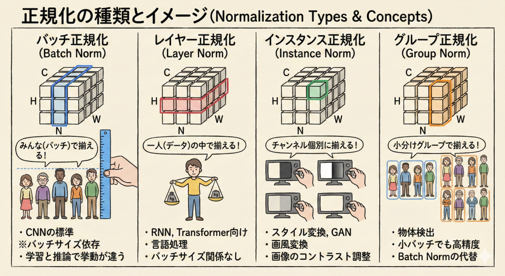 - 学習と推論の違い:バッチ正規化だけは、学習時(その場のバッチ統計量)と推論時(全体の移動平均)で使用する統計量が異なります。他の3つは学習・推論で同じ計算を行います。