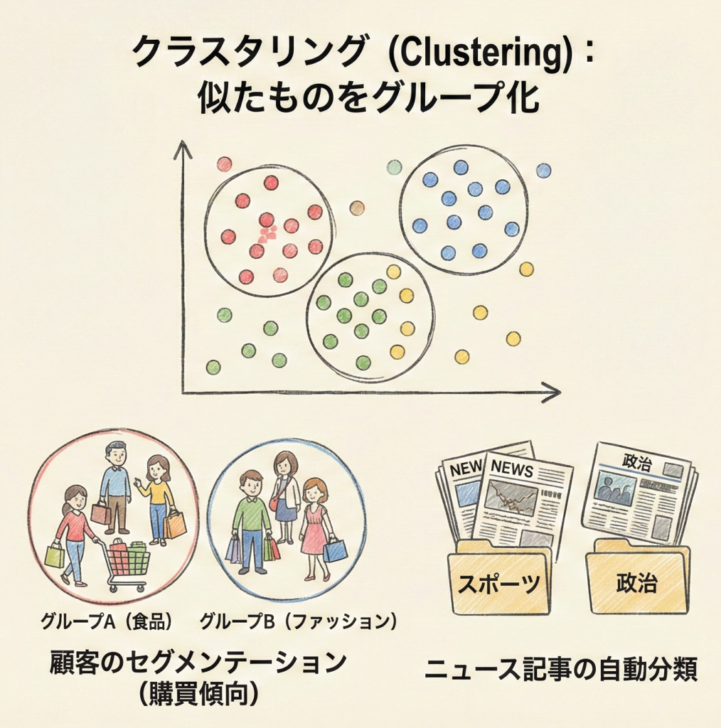 データを似たもの同士のグループ(クラスタ)に分ける手法。例:顧客データのセグメンテーション(購買傾向が似ている客をまとめる)、ニュース記事の自動分類など。