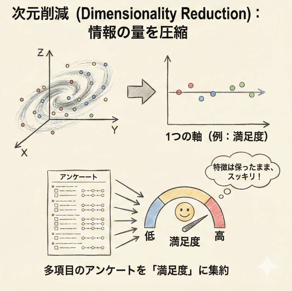 データの特徴を保ったまま、情報の量(次元数)を減らす手法。例:多項目のアンケート結果を「満足度」という1つの軸にまとめる(主成分分析など)。